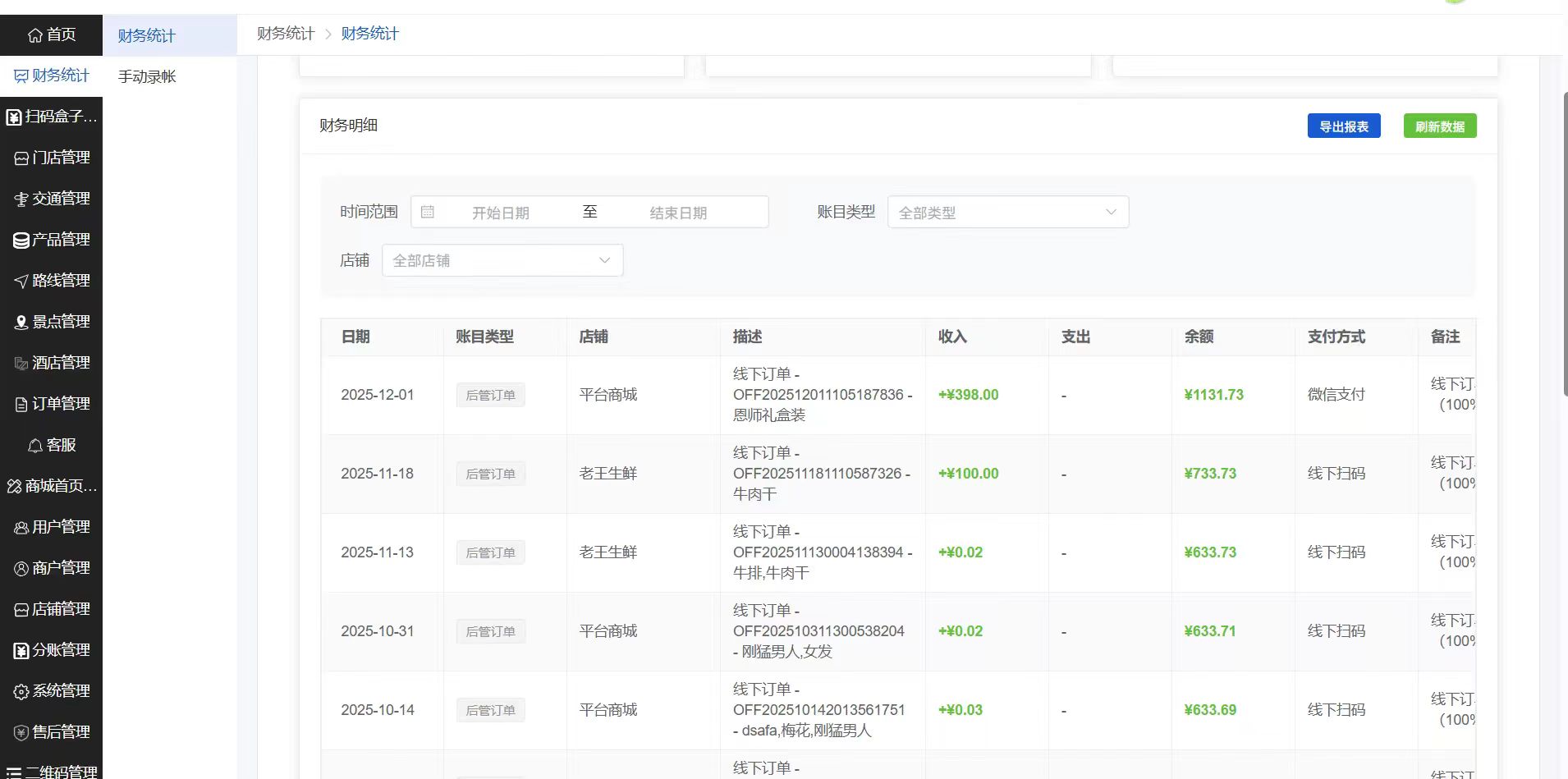 穿透式明细查询:如同您看到的界面,可按照 日期、账目类型、门店、支付方式 进行多维度钻取,追溯任意一笔收入的来源订单。